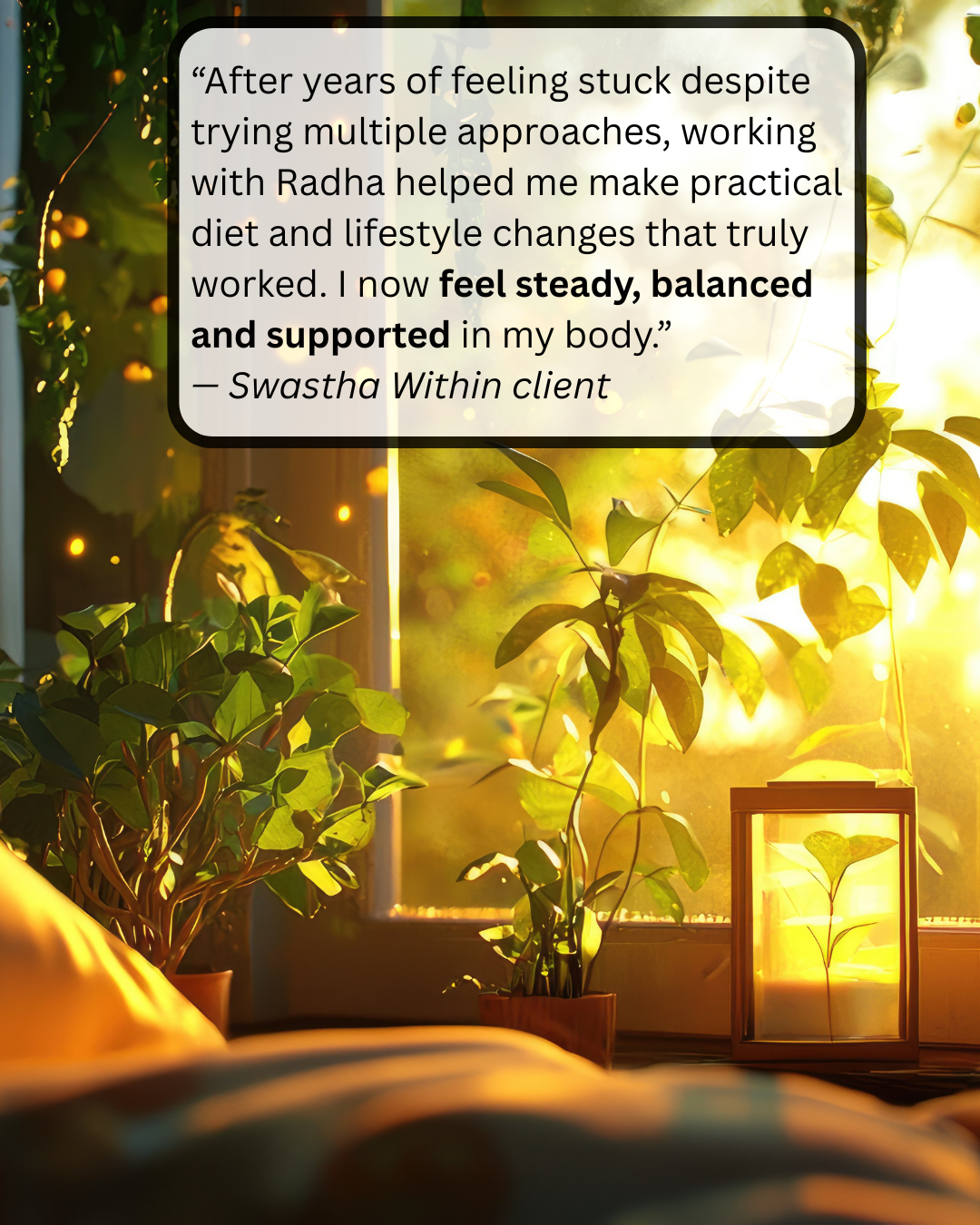 This method honors you — your constitution, your life context and your pace. Through simple, nature-aligned practices that support digestion, the nervous system, daily rhythm and emotional wellbeing, the Swastha Within™ Method helps you create the right conditions for balance and resilience.