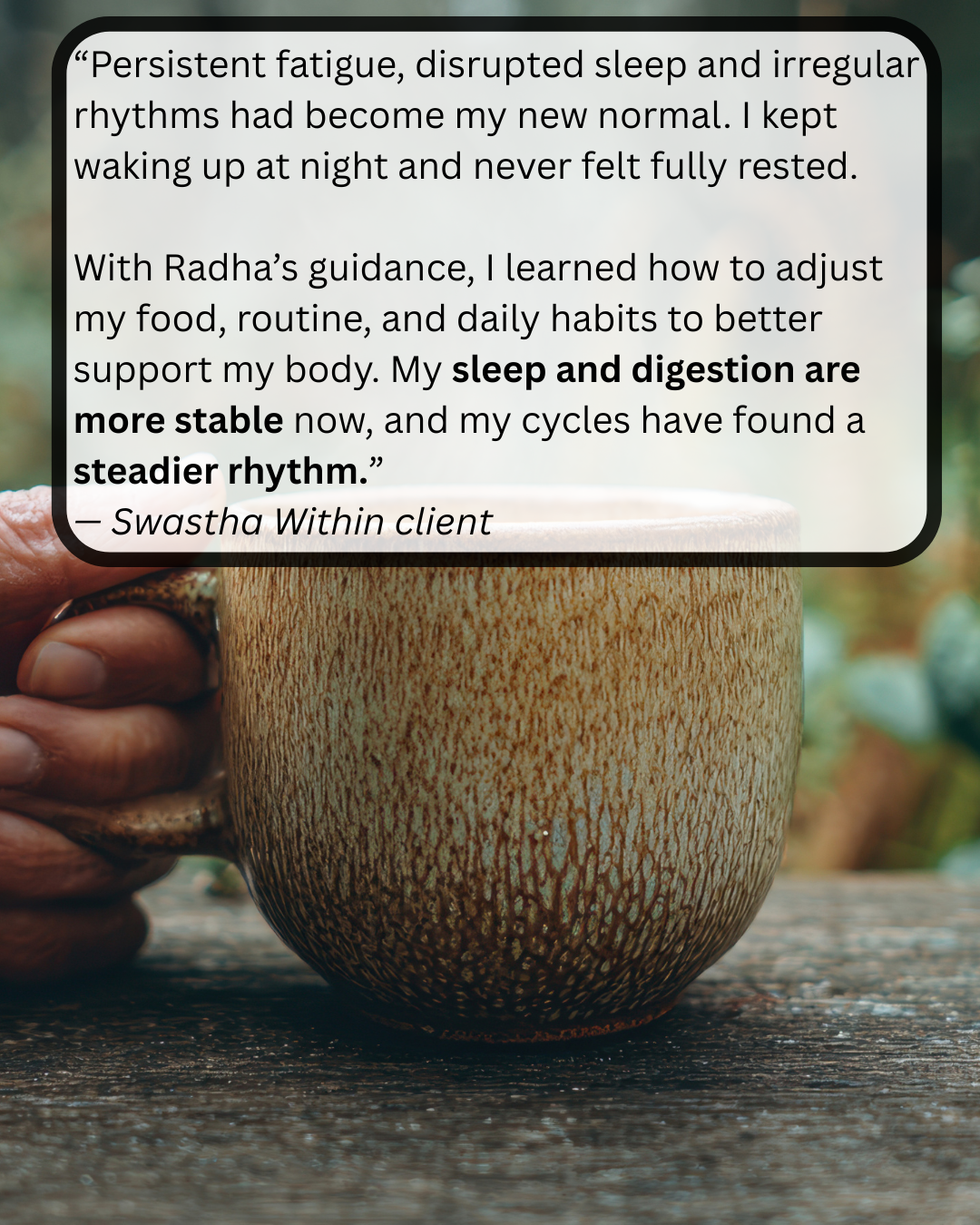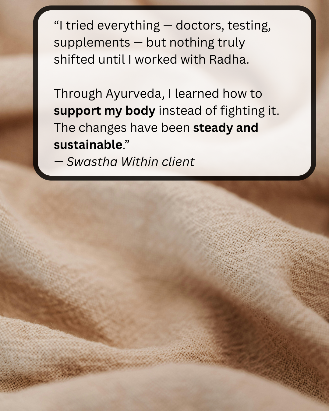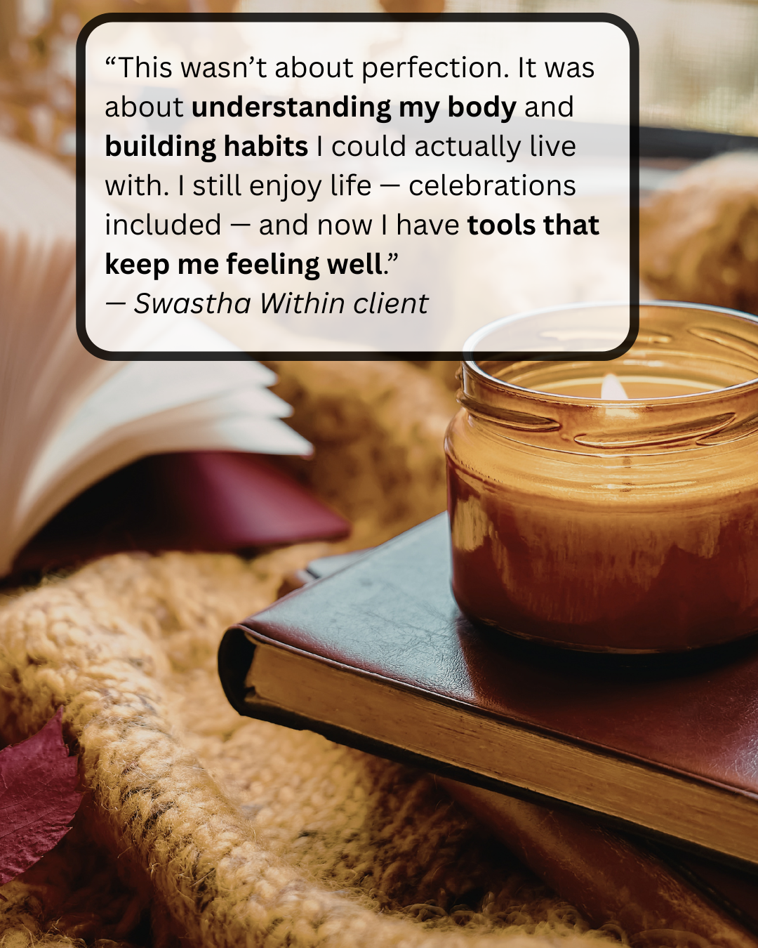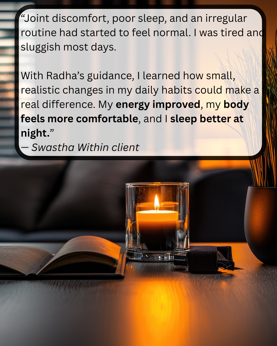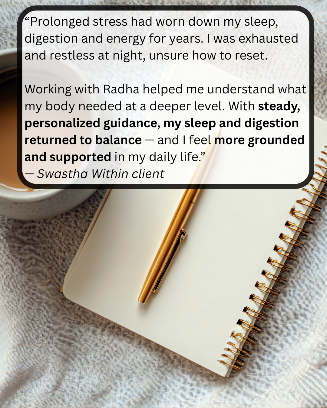 After our session, you’ll receive a thoughtful, personalized Swastha Within™ Plan by email.